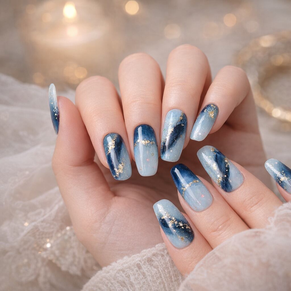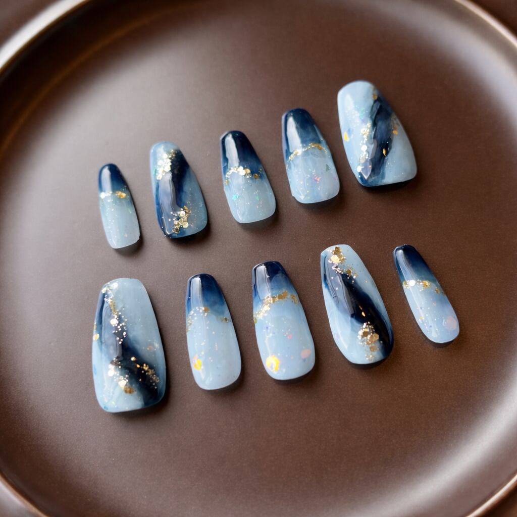 ゴールドのアクセント: 派手すぎない金箔とラメが、落ち着いたブルーに華やかさと上品さをプラス。